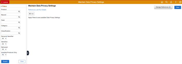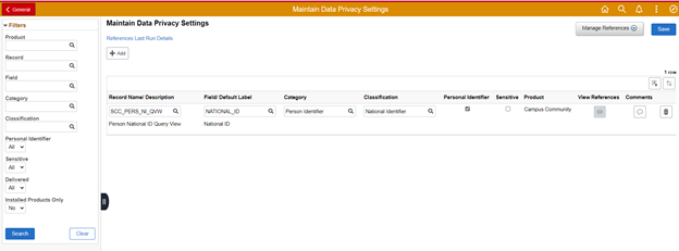 Note the different search options. One obviously personally identifiable piece of information is Social Security Number, or National ID within PeopleSoft. For example, a search can be performed on the field NATIONAL_ID to view all of the entries into the Maintain Data Privacy Settings list for that field.