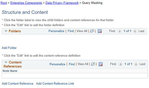 If all of these components are not in the permission lists, they will need to be added. To add the additional components, navigate to PeopleTools > Portal > Structure and Content. Scroll down and select Enterprise Components. Scroll down the list of Enterprise Components and select Data Privacy Framework.