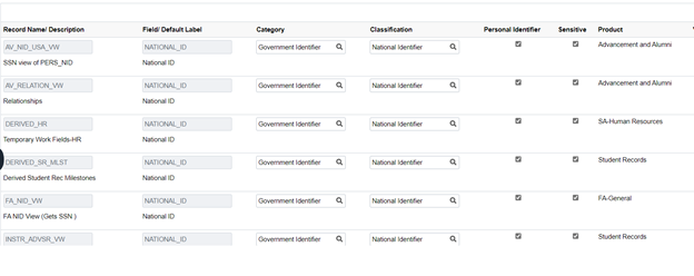 SCC_PERS_NI_QVW is a common record used within SR reporting at some institutions. The example above shows the additional of this record, specifically the field NATIONAL_ID, to the Maintain Data Privacy Settings list. To find out more about adding PII fields, view Chapter 13 of the April 2021 release PeopleSoft 9.2: Enterprise Components.