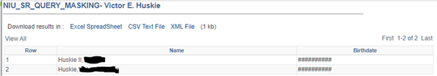Navigate to Enterprise Components > Data Privacy Framework > Query Masking to identify, by security role, who should have access to the PII. For example, at Northern Illinois University, the custom role NIU_CS_SR_REPORTING_WRITE_QRY is assigned to few users who have administrative query writing access, including the highest level of access on the SR query tree access group. This role should be granted access to PII. Another role, NIU_CS_SR_QUERY_CAMPUS, is a role allowing distributed college and department users access to a select set of custom views used to write a series of ‘campus queries’, to which those users have view/run-only access. That role should not be granted access to PII.