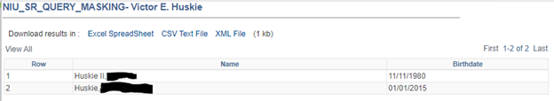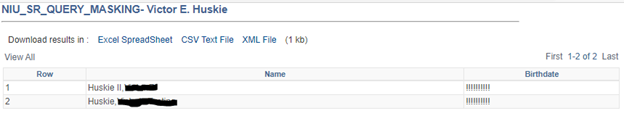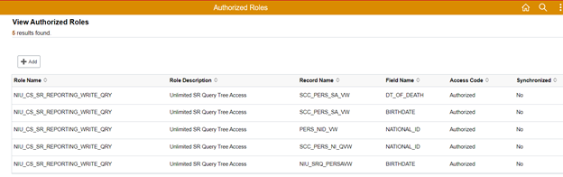 The last entry on the page in this example is a custom view written for campus queries, limited to users with the NIU_CS_SR_QUERY_CAMPUS role, but that is not the role associated with the view in this list. Therefore, campus query users should not have access to birthdate, but query administrators with the role listed should.