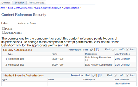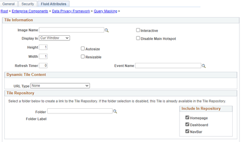 Before query masking can take effect, data fields in the SIS need to be identified as personally identifiable information (PII). This is done on Enterprise Components > Data Privacy Framework > Maintain Data Privacy Settings. Notice that this, and the other Query Masking-related pages, are fluid pages.