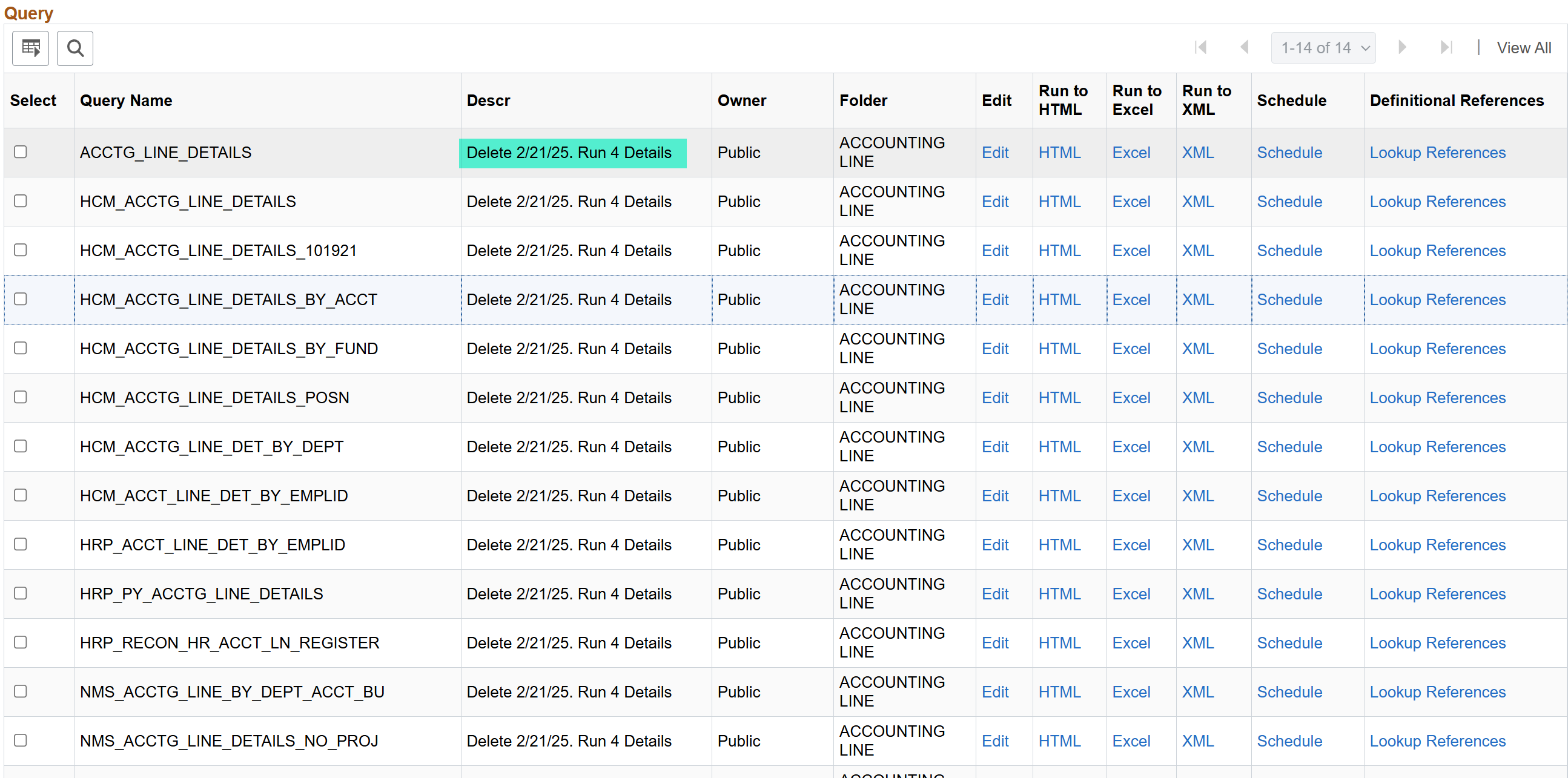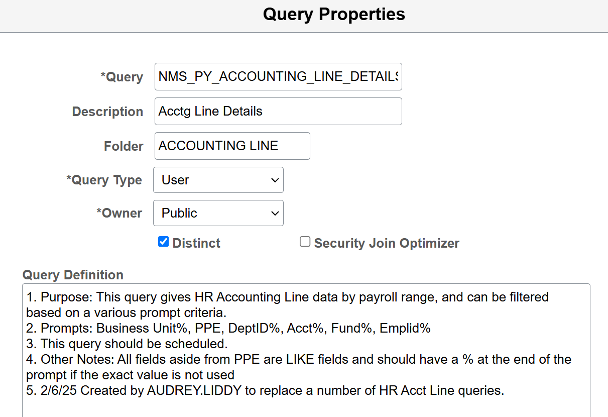 - As we are analyzing these queries, we also started standardizing the use of the LONGDESCR field on PSQUERYDEFN (screenshot below). We are putting 5 notes in the field: 1. Purpose of the query, 2. the prompts that are on the query and if there's anything special about them 3. whether or not the query needs to be scheduled 4. Any other notes that our team thinks is relevant (mostly just for our own team's use/knowledge) 5. Change log. Our goal is to create a query that queries the PSQUERYDEFN and shows users all the queries and the purpose behind them. We will probably have to build a view to do this as we found we cannot do a substring on a text field--we need to figure this part out.