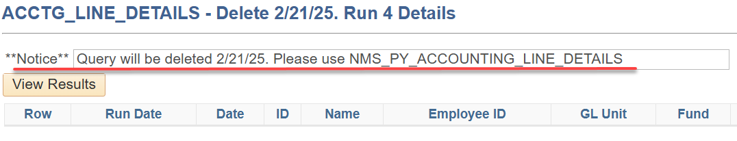 - We have queries that are not named using our newer naming convention. In the name, we now always work to identify what kind of query it is. For example, for all of our queries for public consumption, we start them off with NMS after that, we identify the area. If it's payroll, it is NMS_PY, if it's benefits, it's NMS_BN. For queries not fitting this convention, they will be deleted or renamed.