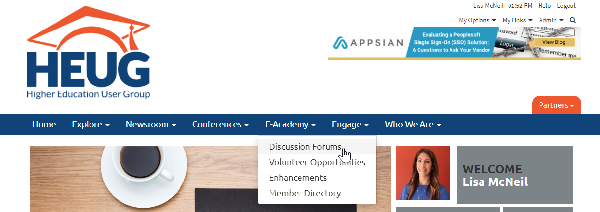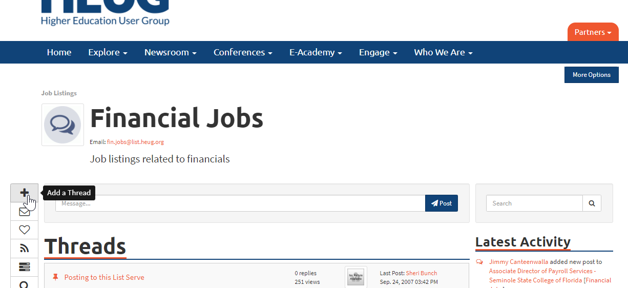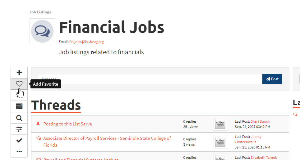 - Once this is granted, you will go to the HEUG website select Engage > Discussion Forums > Job Listings from the toolbar.